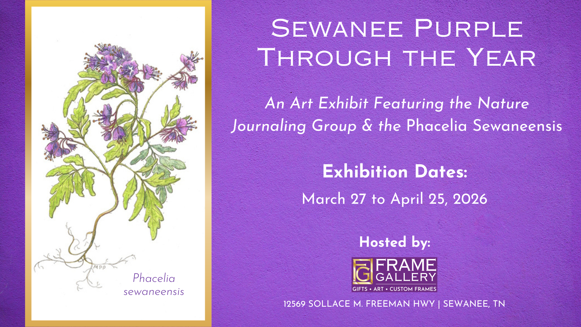 Inspiration for Frame Gallery Gifts and Art’s 6th Annual Nature Journaling exhibition, Sewanee Purple Through the Year, came from the 2025 discovery of a new plant species, Phacelia sewaneensis, a purple scorpionweed that blooms in Sewanee’s Shakerag Hollow each spring. The show is open to the public from March 27 to April 25, 2026.